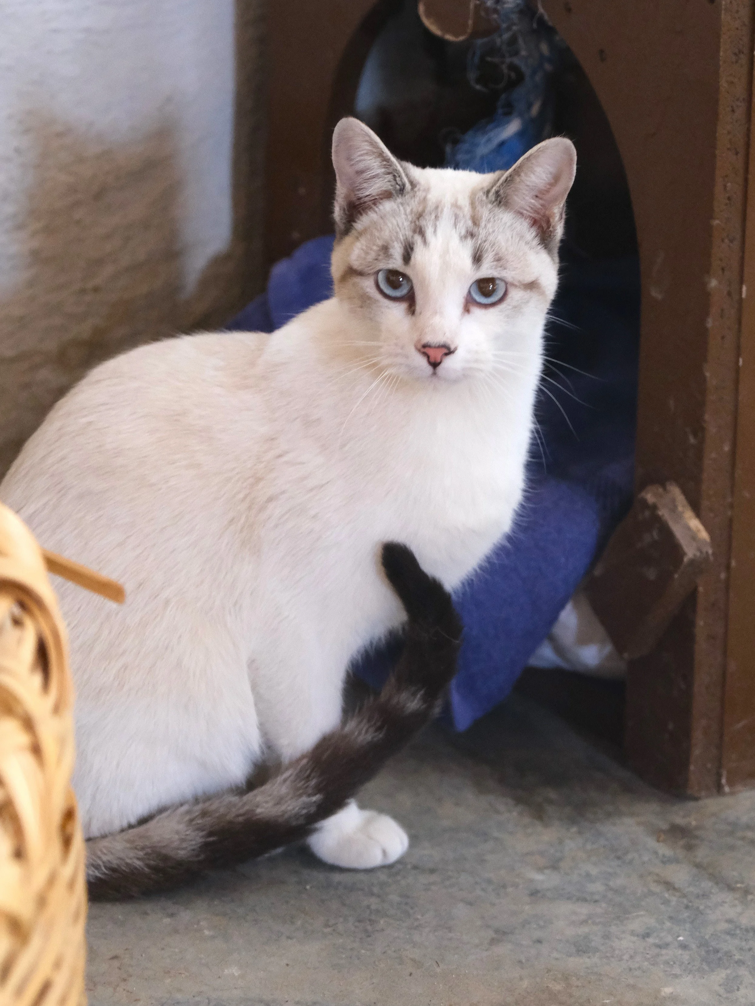 With his striking blue eyes and sleek coat, this Siamese is as affectionate as he is handsome. He loves to cuddle, purrs contentedly, and enjoys attention from his human friends. He’s ready to be your loyal companion and bring joy to your home.